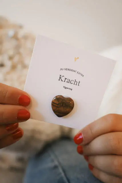 Een lief en krachtig mini-cadeautje voor jong en oud: een vierkant kaartje (7,5 x 7,5 cm) met daarop een klein tijgeroog hartje en de boodschap “Jij verdient extra kracht.”